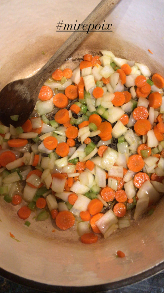 - Sauté the celery, carrots, and onions in a large soup pot with the butter and oil over medium-high heat for 5-7 minutes. I start with the carrots, give those 2-4 minutes on their own, then add the celery and onions. You should be adding salt and pepper throughout the cooking experience; starting here.